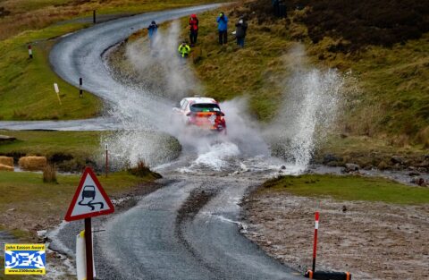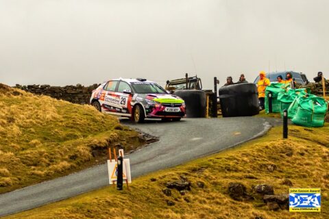 It also left MacKinnon in control, but as reported earlier, he too had his troubles. On the final stage of the afternoon he was having engine coolant pressurisation problems. These continued at the start of the third Leg and there was doubt whether he should carry on or not, but with the McKinstry Impreza running in ‘safety’ mode, the job was on. Fortunately he had over 3 minutes in hand over John Cope, but the Lancastrian was aware of the local man’s problems and turned up the pressure.
